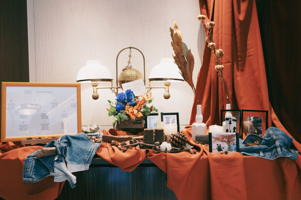 ウェルカムスペースや会場装花には勤務先のデニムを使用してオリジナリティを!