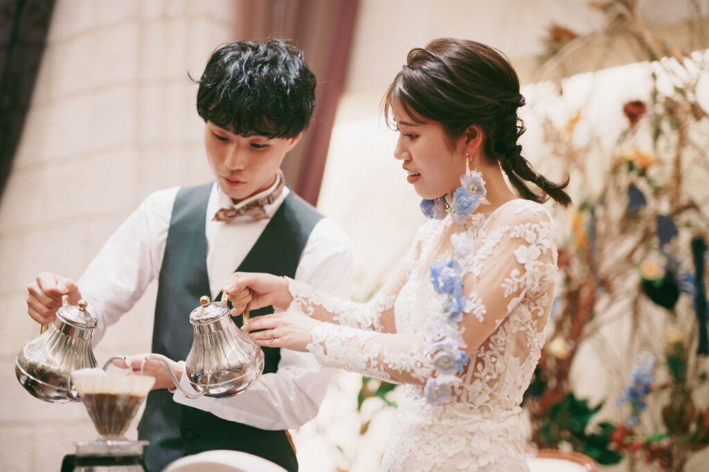コーヒーがお好きなお二人でしたので、日本伝統のお祝い儀式である「水合わせの儀」を思わせるようなコーヒードリップセレモニーを・・・。